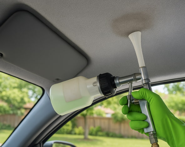 Professional detailers clean car headliners using a soft-bristle brush, microfiber towels, and a fabric-safe cleaner like foaming upholstery cleaner or diluted APC. They avoid soaking the fabric to prevent sagging and typically blot instead of scrub to preserve the headliner’s adhesive.